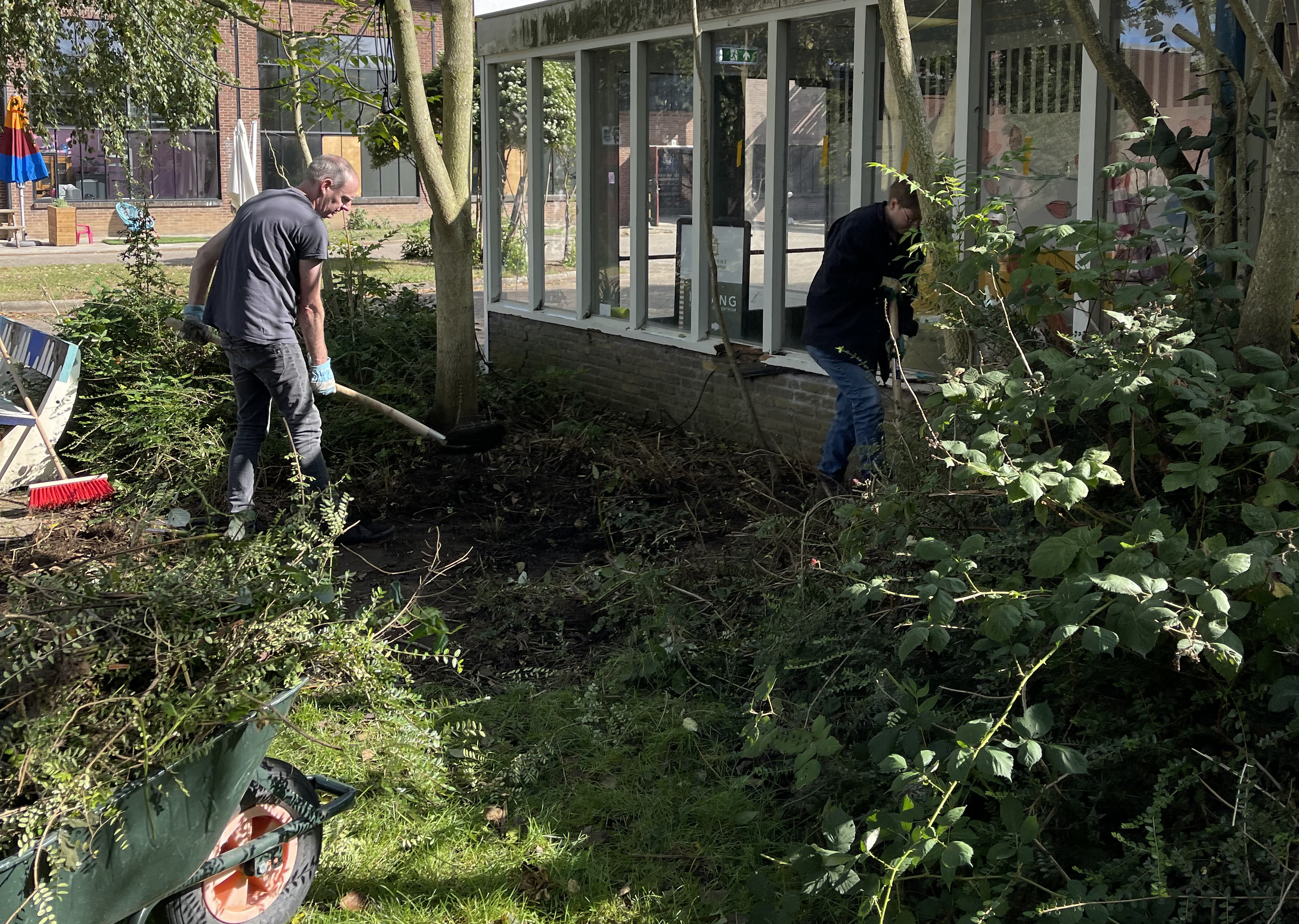 "We vinden het fijn om regelmatig samen te werken bij De Groene Transformator. Elke dinsdagochtend komt onze klusgroep bijeen, en elke keer wachten ons nieuwe klussen. Dit varieert van schilderwerk tot het maken van kledingrekken uit gerecycled hout, en zelfs het bouwen van een serre."