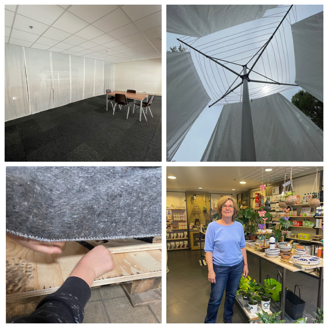 Ook bij deze pop-up locatie proberen we alles zoveel mogelijk te hergebruiken. De witte vitrages hingen een paar weken geleden nog in de artiestenkleedkamers van Theaterhotel De Oranjerie. Het zwarte klittenband waarmee de vitrages aan het plafond gemonteerd zijn, komt van het podium van het theater. Enkel de tape is nieuw. Zo proberen we alles zo goed mogelijk te hergebruiken.