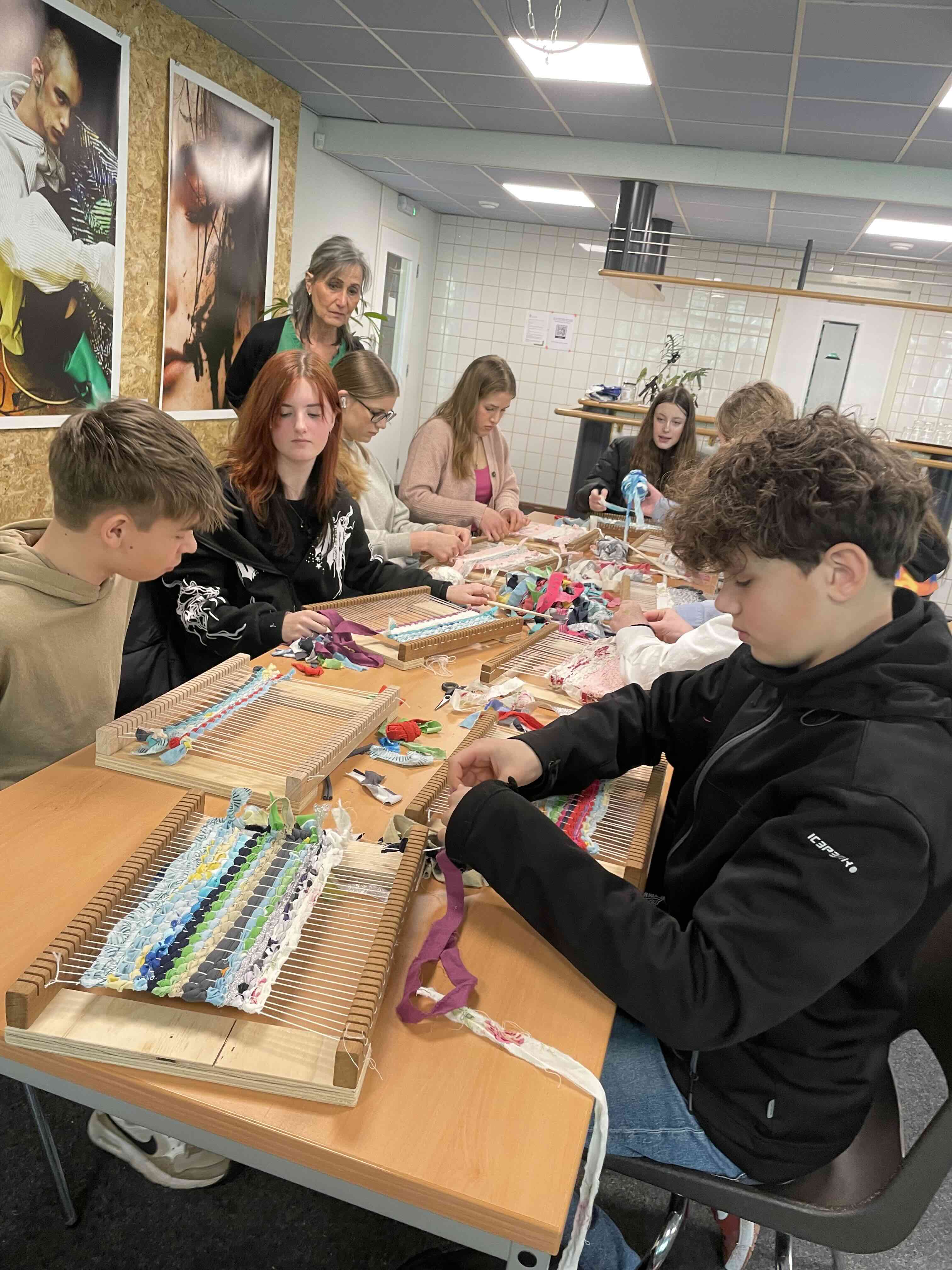 Na de presentatie zijn de leerlingen aan de slag gegaan met een weef workshop. Hierbij werd een nieuwe bestemming gegeven aan oude afgedankte stukje stof door deze de weven tot bijvoorbeeld een onderzetter. Het gaf de leerlingen ook inzicht in hoelang het duurt voordat je met een ambacht als weven een bruikbaar resultaat hebt. Tijdens deze creatieve activiteit was er natuurlijk ook voldoende ruimte voor het sociale aspect. En er werden vragen gesteld en gesprekken gevoerd over de items uit de presentatie. We hoorden opmerkingen zoals “ik vind het na een uur wel genoeg geweest, hoe houden die kinderen in de productielanden dit vol als zij 13 uur op een dag hetzelfde werk moeten doen, en ook nog eens in slechte omstandigheden”. Het was goed om te zien hoe de groep aan het denken was gezet over het thema fashion en hoe ze zelf een positieve impact kunnen maken.