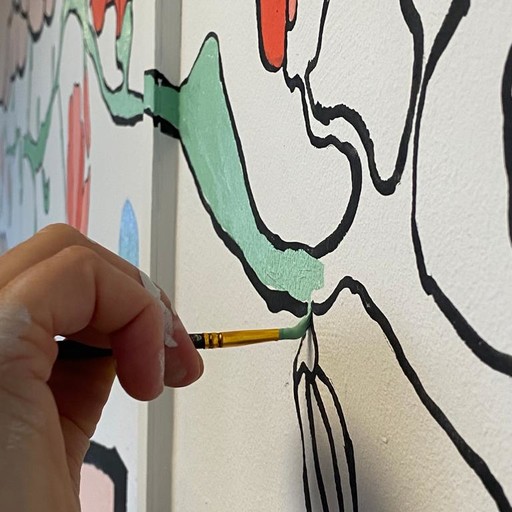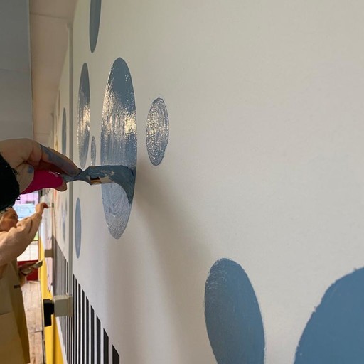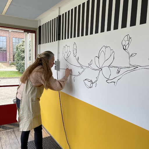 Bij binnenkomst in De Groene Transformator word je direct verrast door een adembenemende muurschildering van Octavie Wolters en Jule Kerbusch. Deze getalenteerde kunstenaars hebben gekozen voor een unieke combinatie van industriële elementen, organische vormen en het teken van groeiende plantjes. Het resultaat is een meesterwerk dat de oude Philipsfabriek eert en tegelijkertijd de schoonheid van de natuur weerspiegelt.