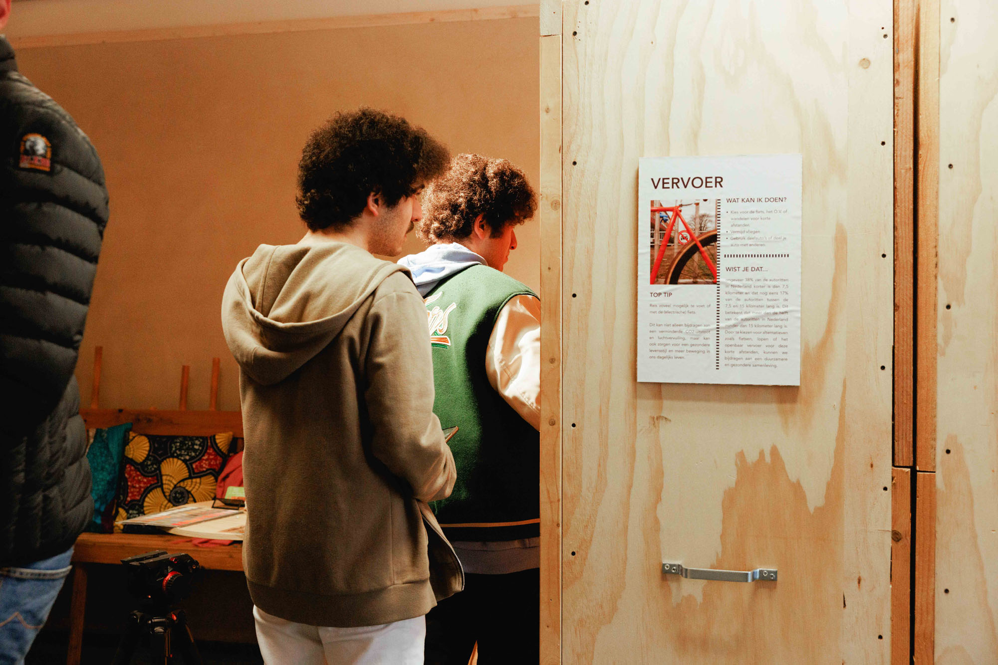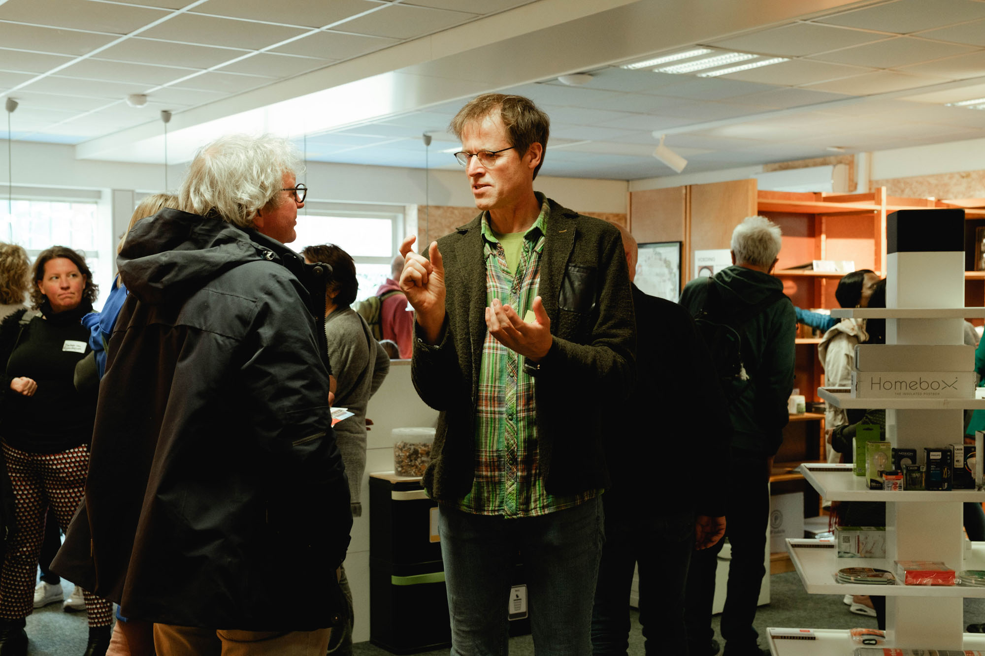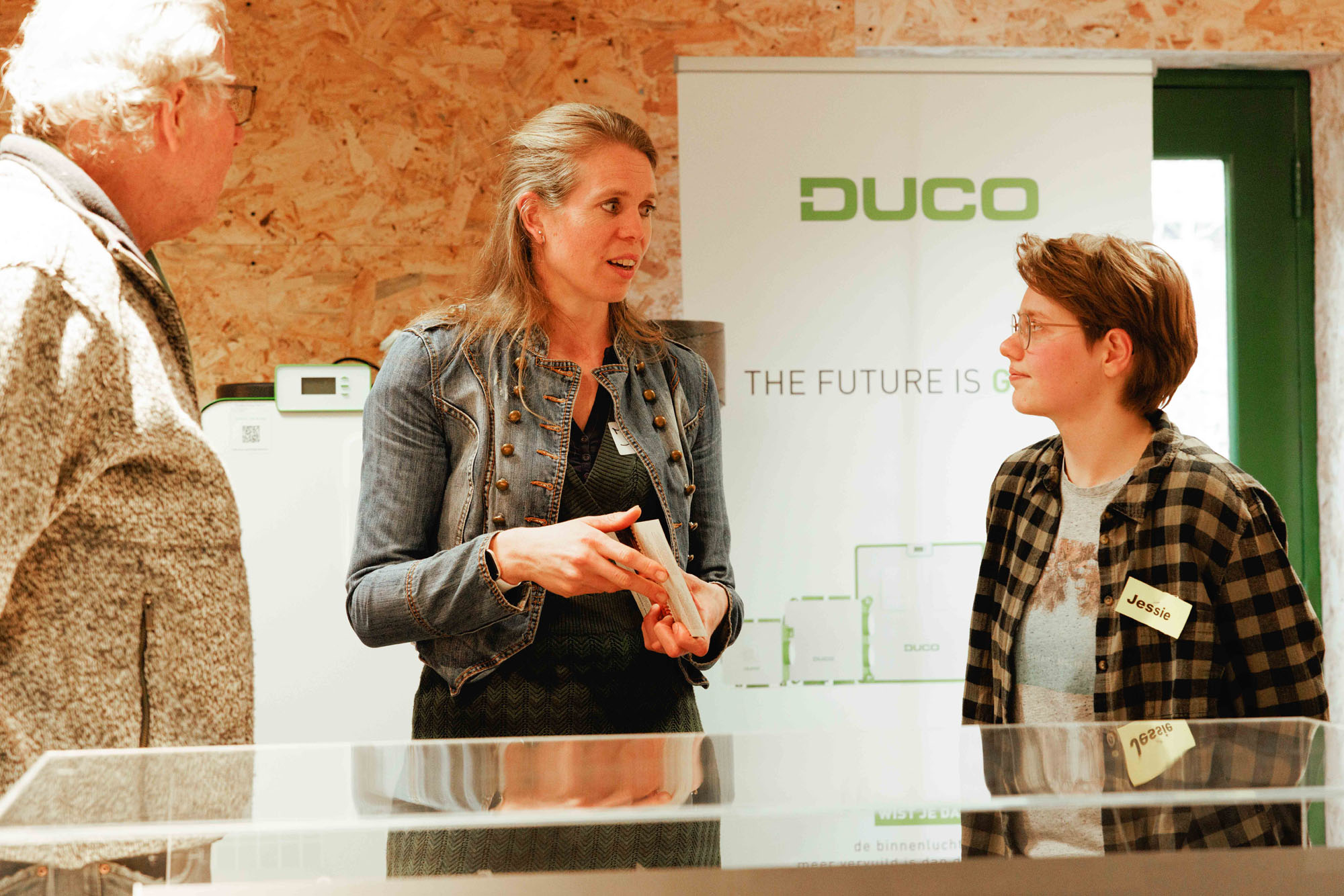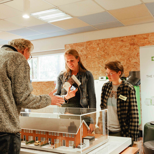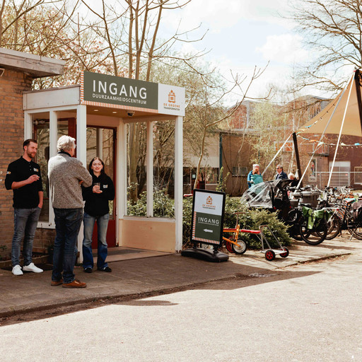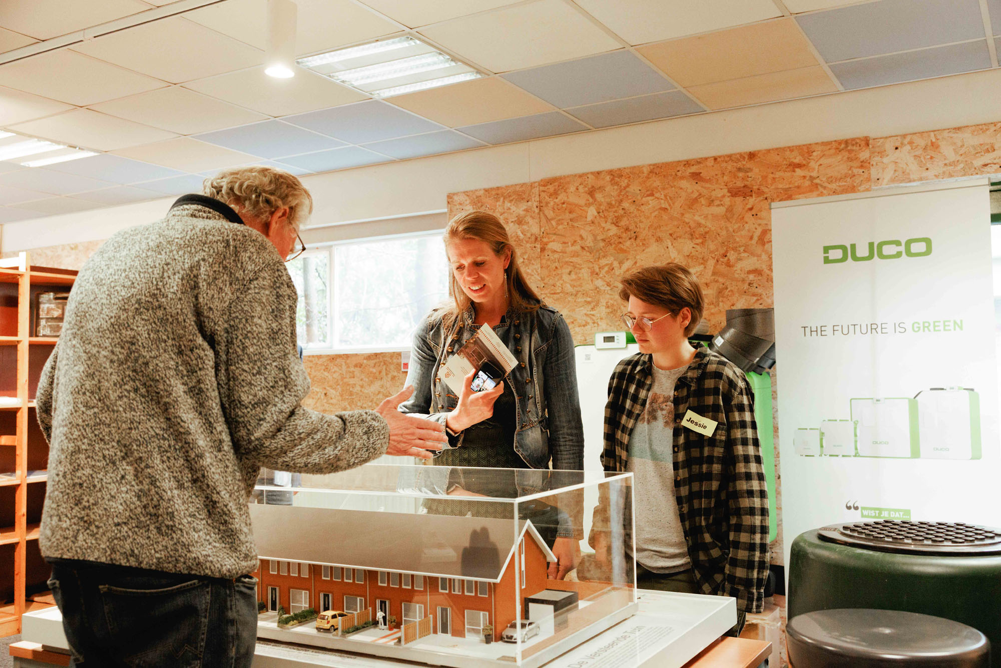 De deuren van het inspiratiehuis staan open en de energieadviseur is tijdens openingstijden aanwezig om de bezoekers gratis energieadvies te geven.