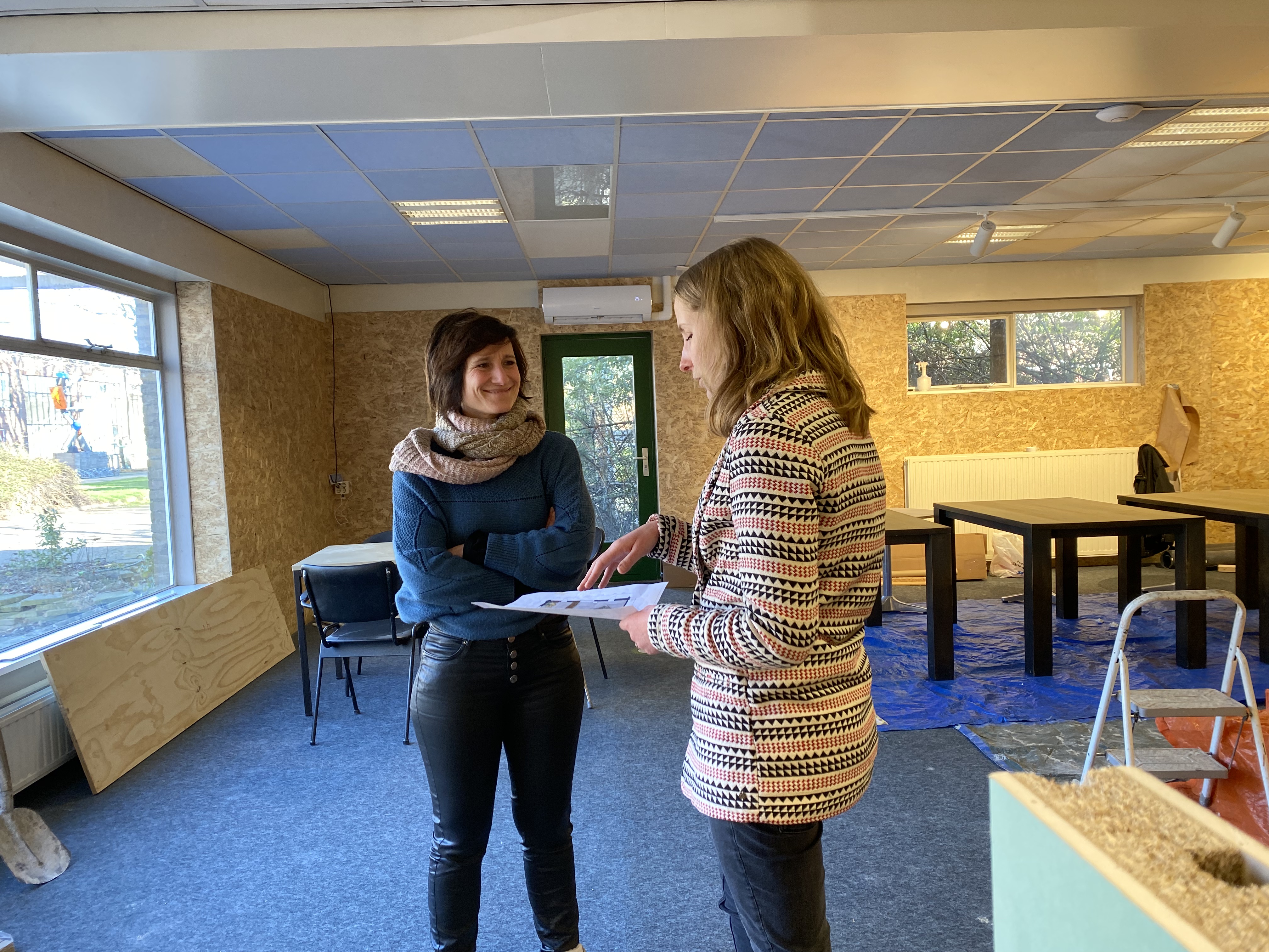 Tijdens het gesprek met Claire Schreurs (Energy & Sustainability Manager) van Smurfit Kappa Roermond Papier, maakte Ilse Meelberghs een foto van Patricia en Claire. Enthousiaste verhalen over de vorderingen en de toekomstdromen van de Groene Transformator klinken door een nog lege ruimte waar volgende maand het bewustwordingscentrum opent.
