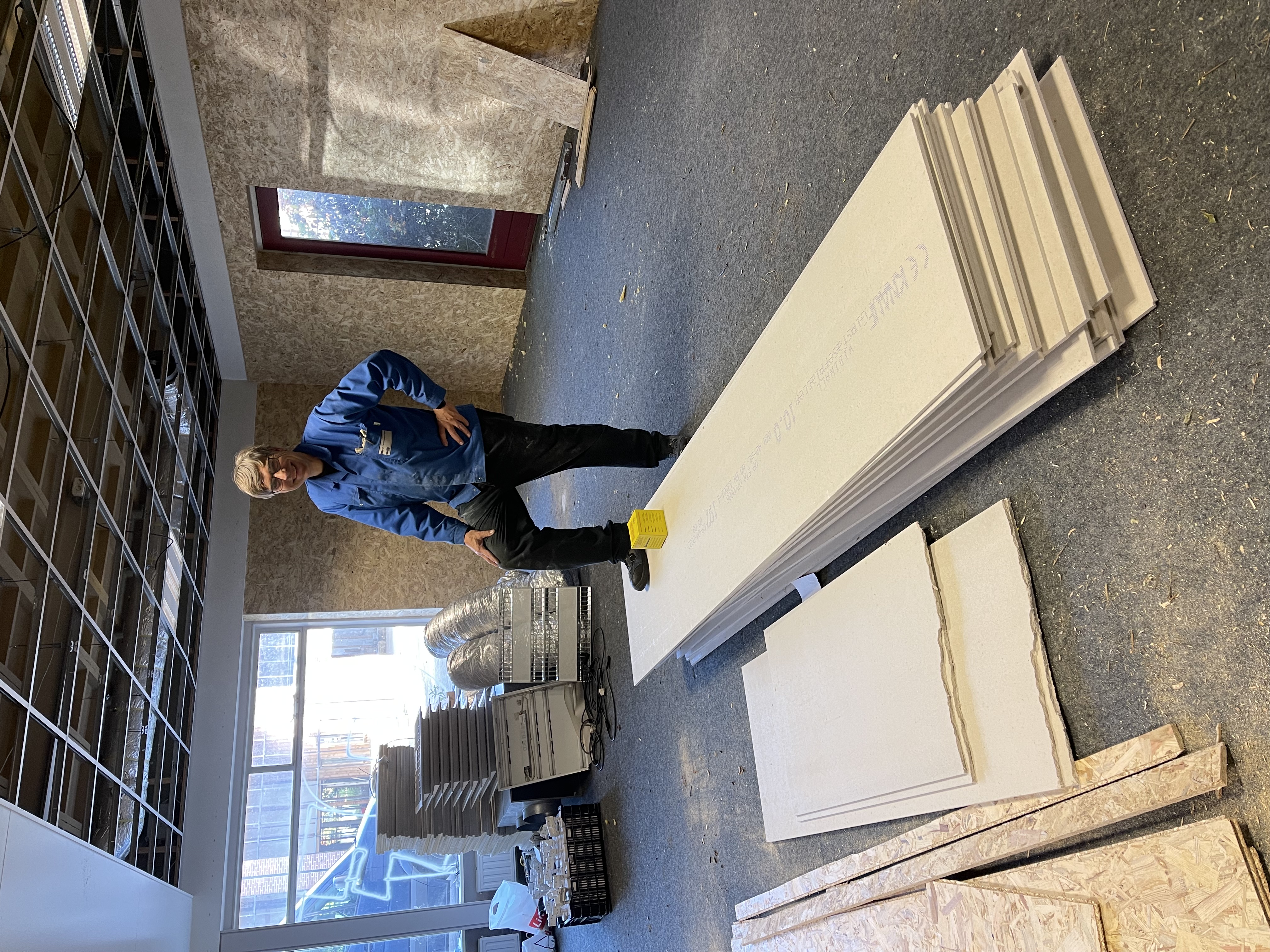 Het verbouwteam was in het voorjaar tot de conclusie gekomen dat leemstuc op hout niet hecht, en dus was er een gipsplaat nodig om de gewenste muur met leemstuc te kunnen realiseren. Maar waar gaan we die vandaan halen?